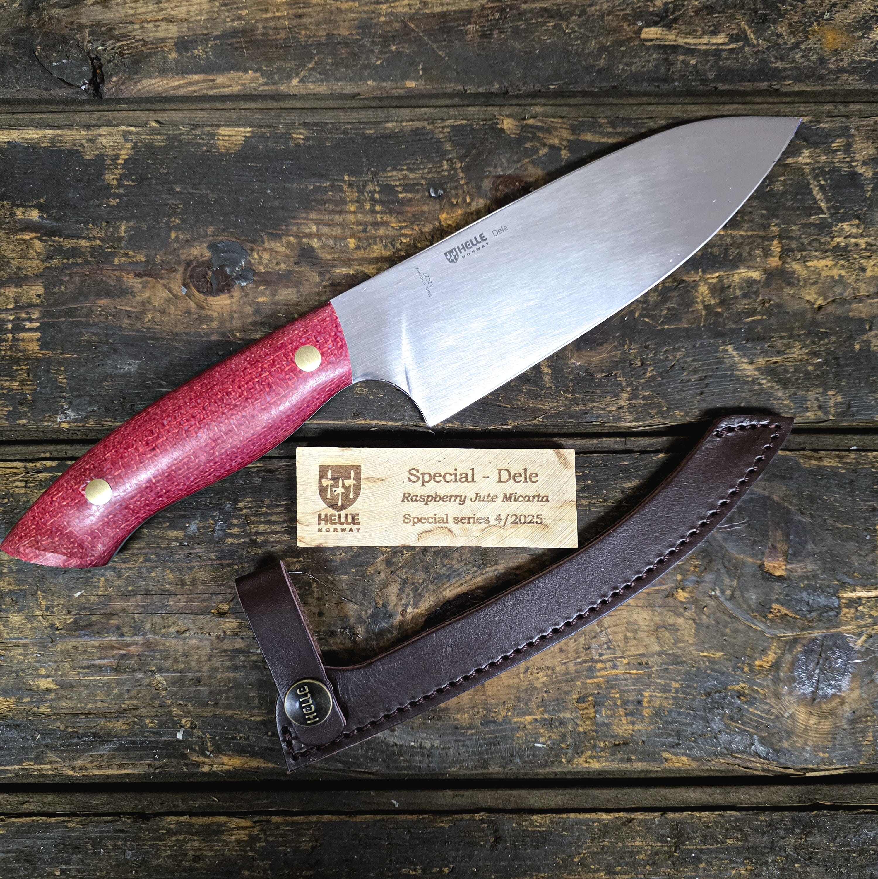 Dette er ein Dele i Helle Spesial-serien: ein spesialversjon av Dele med skaft i Raspberry Jute Micarta. Micarta er eit kunststoff som er særs vassavvisande og gir eit godt grep. Dei raudlege tonane i Raspberry Jute gir eit flott særpreg. Berre tilgjengeleg i særs avgrensa serie. Blir levert med slire i brunt lær.